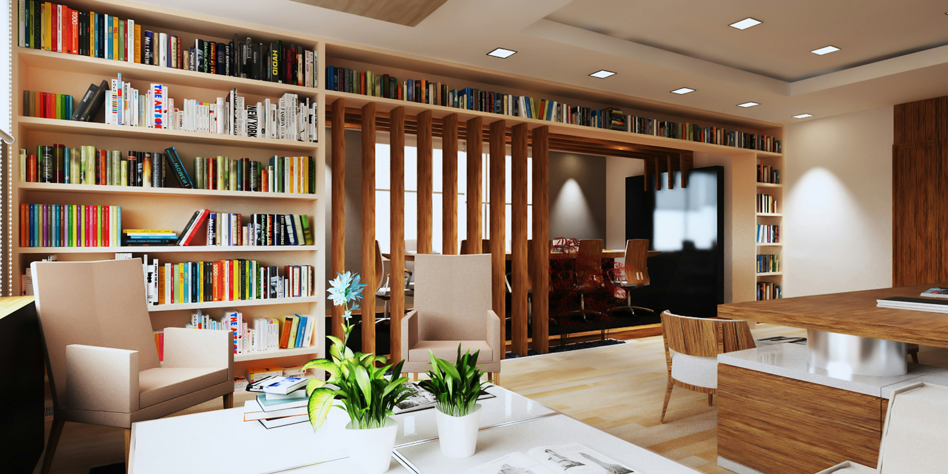 Store, åbne reoler kan bruges som rumdelere i åbne planløsninger. De giver struktur og afgrænser zoner uden at lukke lyset ude, hvilket skaber en fleksibel og luftig indretning.